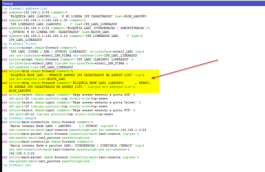 csjuniormga bom dia obrigado pelo retorno. Bom estas regras que voce indicou bloqueia toda a faixa da lan1 e libera apenas os ip que cadastrei em liberados.... tanto pra lan1 quanto lan2. Mas vou fazer o teste de liberar pra verificar. mas como disse anteriormente fiz aquela regra e liberou "all ethernet". Mas testei novamente tirando o "all internet" (isso em nat) e pingou... Mas agradeço a boa vontade de todos em ajudar... Obrigado.