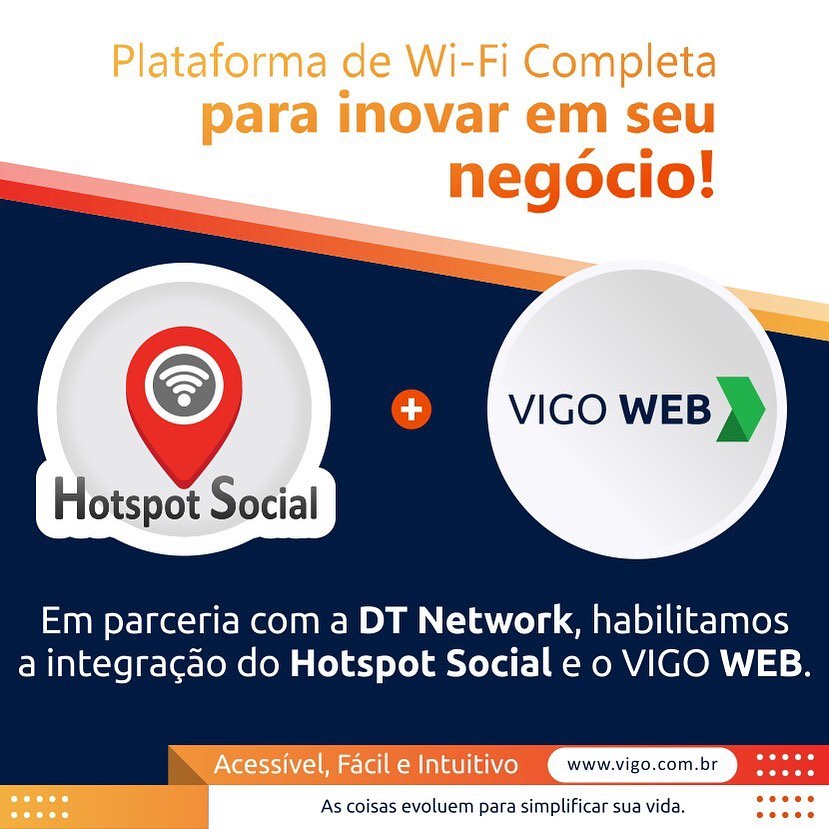 É com imensa alegria que informamos que agora o VigoWEB possui integração com HOTSPOT SOCIAL da DT NETWORK, mais uma opção para fazer o seu provedor se destacar e fidelizar seus clientes.