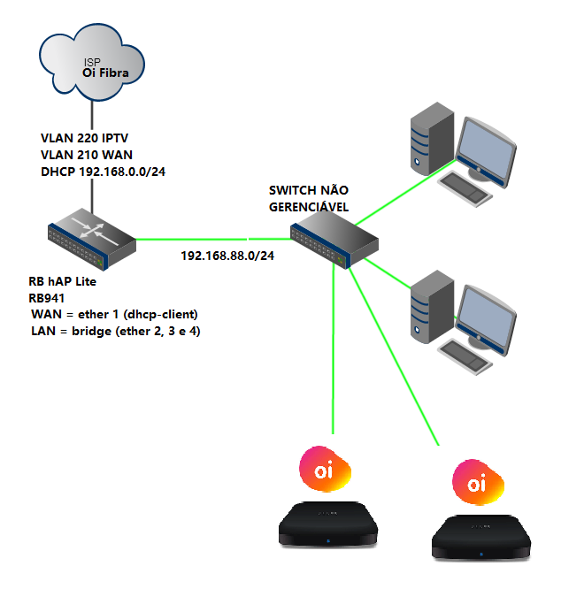 Bom dia, eu consegui fazer funcionar, de maneira muito satisfatória, dois pontos de IPTV da Oi usando o modem que me foi fornecido pela empresa Oi apenas como um roteador de entrada, usando o script de desbloqueio HTML fui nas configurações do modem Oi Fibra e desabilitei o IPV6 e as opções de Wi-FI, mas deixei o IP padrão desse modelo Nokia que é 192.168.1.254. Usei uma RB 750GL (Gigabit) para testes, abaixo o script das configurações, que estão basicamente no padrão de "reset" deste modelo.