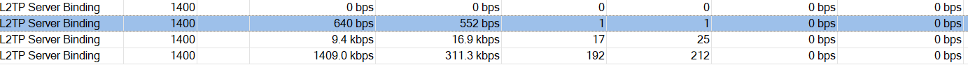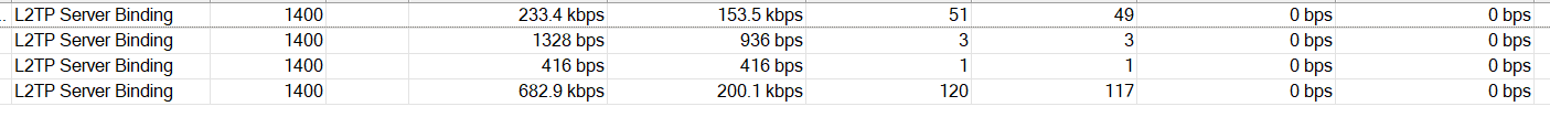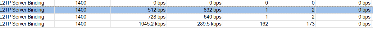 Foi até as conexões da VPN e encontrei algo muito estranho, como pode ver na imagem abaixo, apenas um computador é que tem um bom Tx, ou resto a velocidade numa chega a 500kb, as vezes cai para 0.