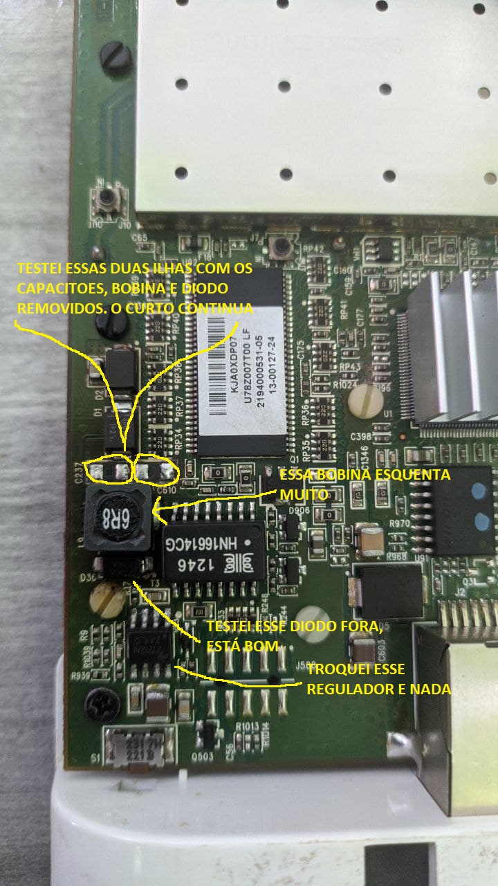 Muito obrigado! Com sua ajuda descobri que o amplificador da chain horizontal estava em curto. Retirei ele e o curto nas ilhas dos capacitores sumiu e o rádio ligou normalmente. Porém tentei acessar no PC e mesmo a LAN indicando tráfego não conectou. Decidi resetar, e pra minha surpresa ao pressionar o reset, o rádio apagou e só ficou aceso o led do power. Vou desistir desse trem, deixar ele pra retirar peças, perdi muito tempo já com ele. Mais uma vez, obrigado!