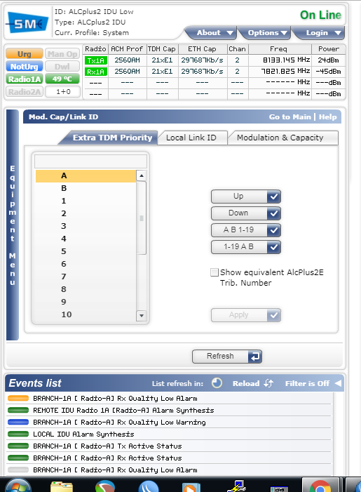 Boa noites amigos, alguém que intende poderia me ajudar a solucionar o problema desse radio alcplus2 siae, as duas luzes vermelhas NURG E URG ficam acessas, antes ele estava funcionado normal, mas trocamos por outro enlace e esse ficou parado, não mexemos em nada, hoje colocamos ele pra rodar de novo mas as luzes não se apagam e um equipamento que esta na outra ponta ping baixo mas começa a perder pacotes do nada e depois estabilizada de novo