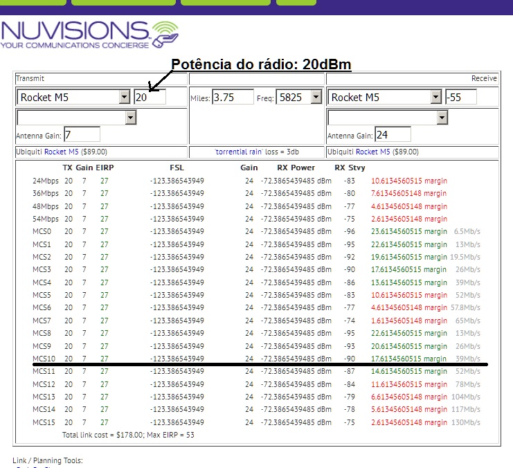 3,75 milhas são 6km. Com 7dBi num lado e 24dBi no outro, sinal a -72dBm. Como seriam 7,5dBi num lado e 24,5dBi no outro, tem 1dBm a mais de sinal, mas ainda é -71,4dBm ou seja, -73dBm na prática porque DUVIDO que terá zona de Fresnel totalmente limpa, nunca tem. Só tem margem suficiente se usar fixo em MCS10, que passará pouca banda.