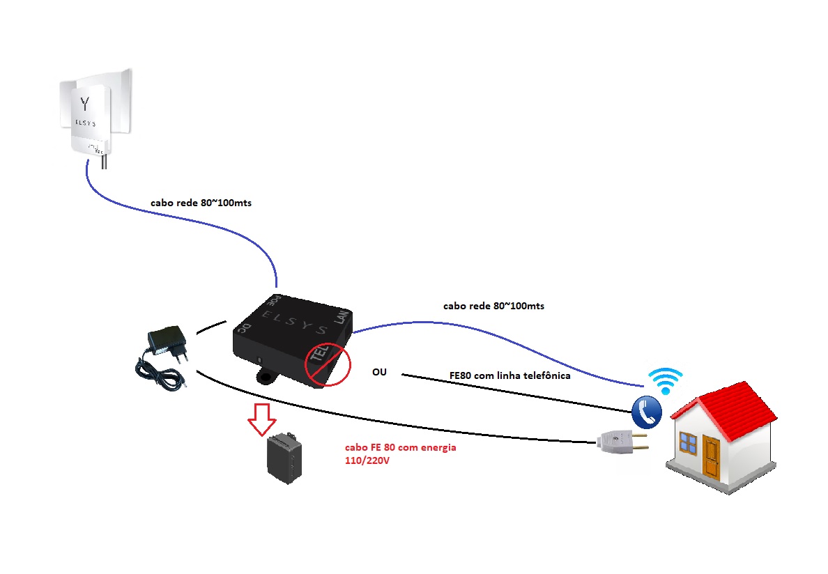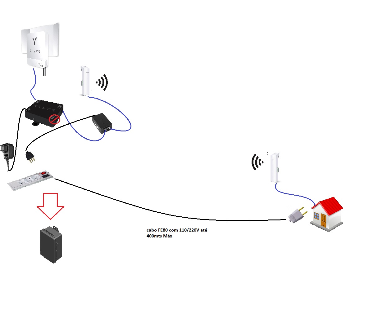Um cabo FE80 telefonico com 110V injetados nele (é pra usar como fio de luz mesmo e não na porta telefonica) e um cabo de rede de 75 metros entre a casa e uma caixa hermetica. Nesta caixa instala o POE com a fonte ligada no 110V do cabo FE80 e o cabo de rede na porta Lan do POE do Amplimax.