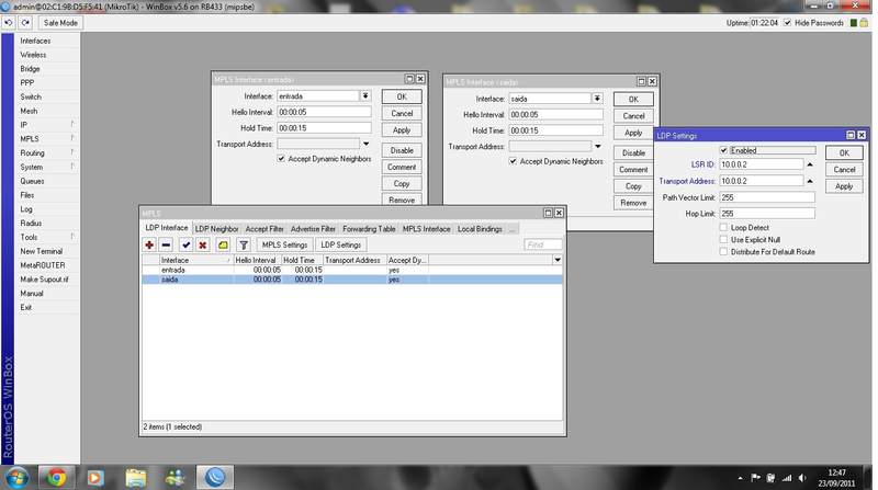 Ip configurado em LDP Settings (MPLS): 10.0.0.2 ( e teria q ser configurado o IP 10.0.0.3 no mesmo lugar pra conectar a interface de saida)