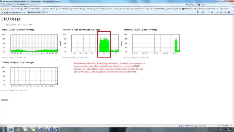 Pessoal, Assunto Resolvido, varios downgrades, e upgrades depois, estou rodando a ultima versão até o momento 5.11 com o processamento baixo de sempre, tudo que tive que fazer foi desativar o protocolo SNMP e desativar os logs de Queues.. Fica ai a dica para quem tiver problema semelhante... Lembrando que sempre tive o SNMP ativo e sempre usai somente o dude para monitorar minha rede, apenas após a versão 5.6 é que começaram os problemas com processamento...