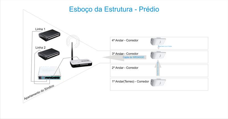 Exatamente, Linha1 e 2 no RB, Controle de Banda, Firewall e talz, tudo no mesmo cara, ai, manda para o "Kaka(TP-Link)", ou outro AP. No corredor 3, do síndico, um NanoSt recebe e irradia, o do 4º e do 1º Andar vão receber e fazer o mesmo. O único andar que não terá um NanoSt, será o 2º. O que acha?