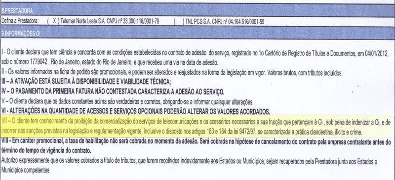 O que mais me admirou quando fui assinar o contrato de um link full da Oi "IP CONNECT" foi uma das cláusulas contantes do formulário de formalização do pedido: "algo como que deixando subentendido... ou até bem entendido... quanto a restrições na venda ou fornecimento de uso para terceiros (clientes ou não).