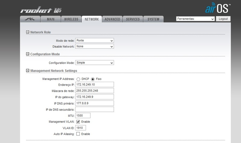 depois criei a vlan 1910 na ubiquiti ap e coloquei o endereço 172.16.249.10, mascara 255.255.255.248, gatway 172.16.249.9