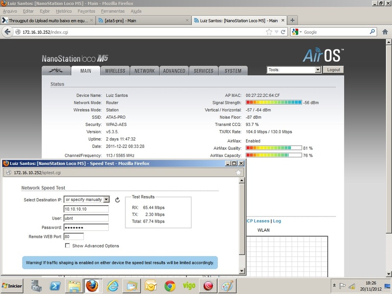 Enfim, aqui o upload melhorou. Tem gente reclamando ja da versão 5.5.4 do AIROS la no forum da UBNT, eu pelo menos to gostando. A opção "alternative" de Data Rate, to usando e não percebi diferença nenhuma até agora.