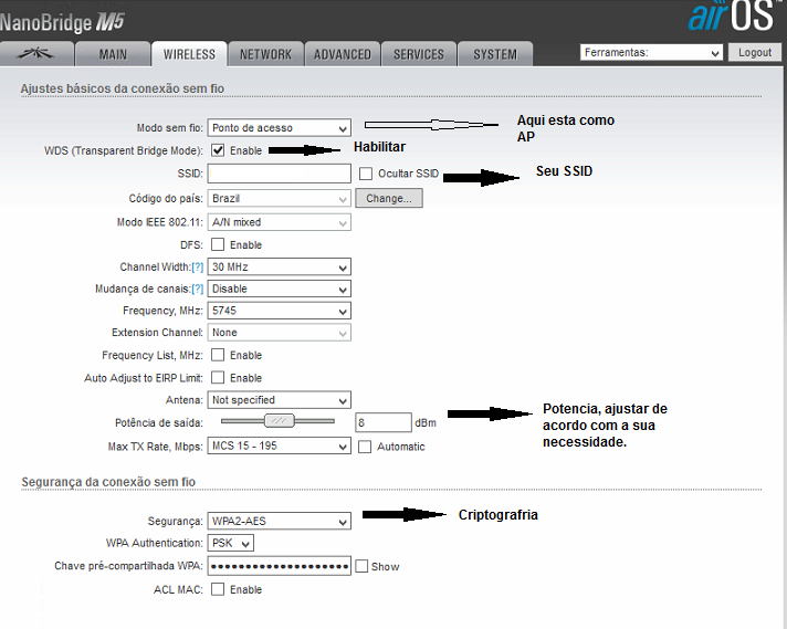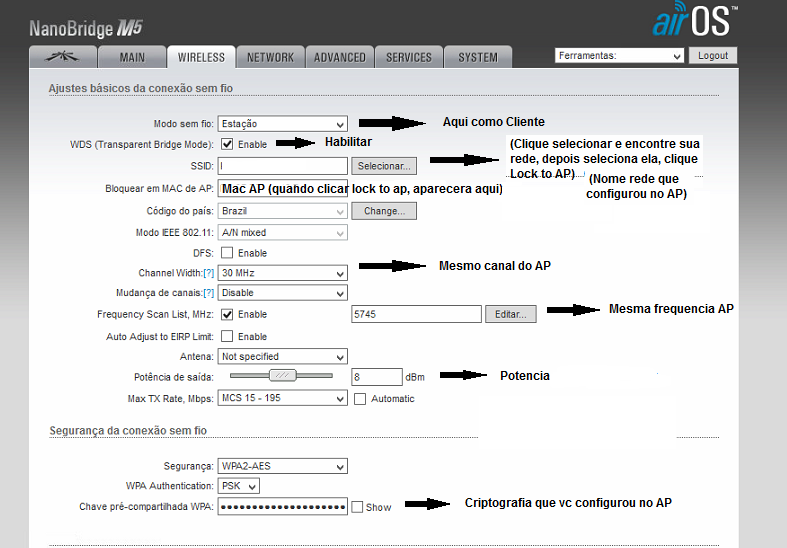 Reinaldo segue em anexo algumas imagens de conf do AP e Cliente, Configuraçoes básicas. A criptografia, frequencia , canal, MCS, distancia, potencia, tem que ser ajustado de acordo com as suas necessidades... O que to te passando sao exemplos de uma configuracao básica de Ap e Cliente num PTP. Teste em bancada e veja se conecta, se sim instale nos pontos e ajuste de acordo com a necessidade... Pois teste em bancada é uma coisa em campo é outra....
