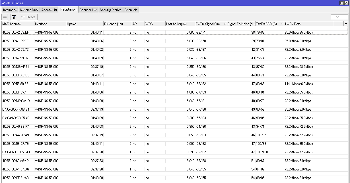 Mas uma coisa que não tem muita utilidade é MAX TX rate alto no cliente. Na imagem tem cliente transmitindo (TX no cliente é RX na torre) em 6M (MCS0) e outros em 65M (MCS7 com GI longo), como o upload de todos é o mesmo, e com upload baixo tipo 1 ou 2Mbs pode usar nos clientes MCS9 (26M) tranquilo! A sensibilidade dos hardwares com esse datarate baixo é bem alta, com sinal -71 é quase impossível não ter CCQ de 95% com MCS9.