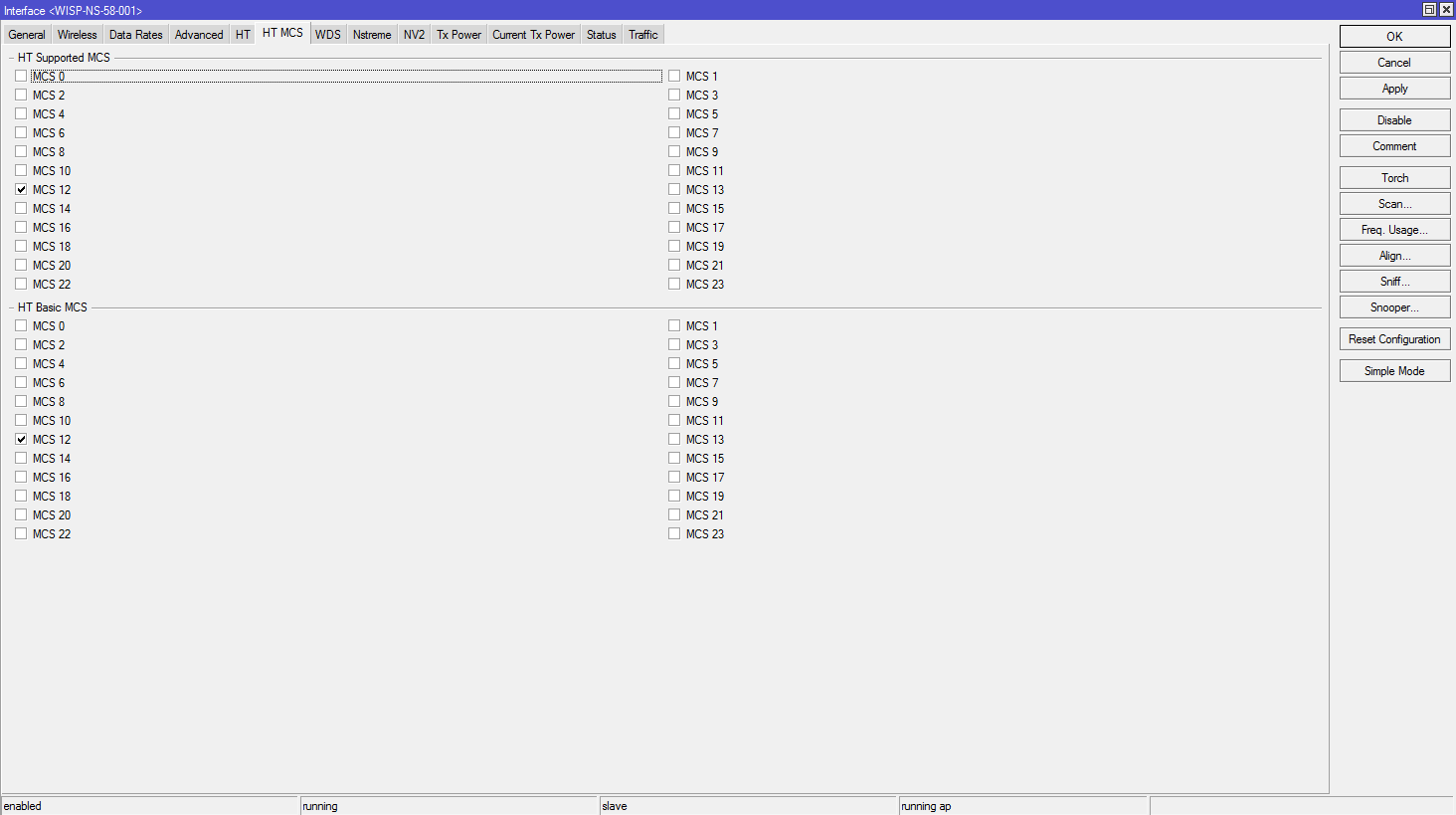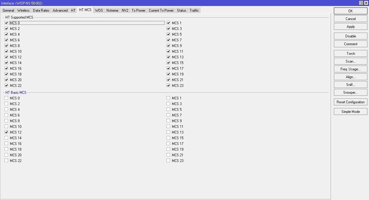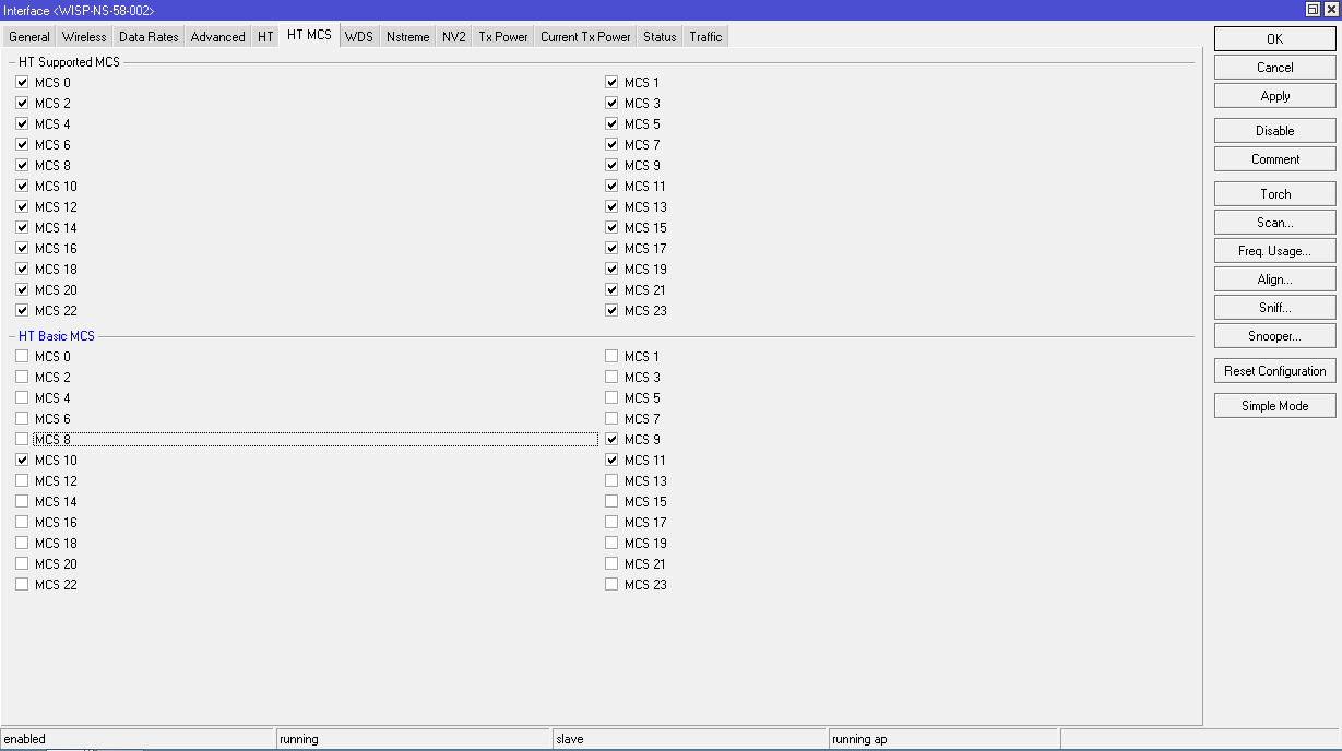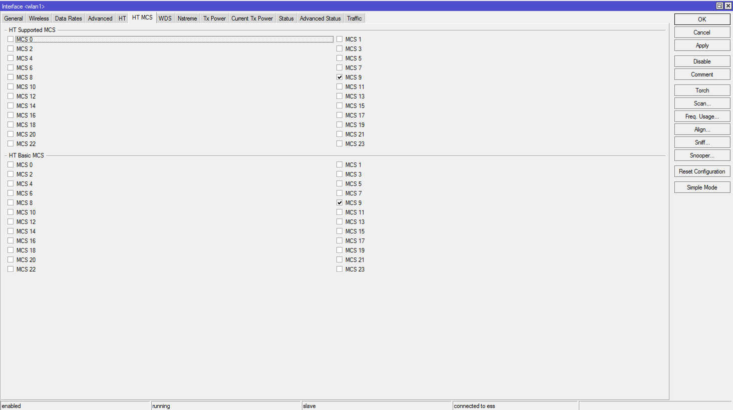 Nos SXT mesma coisa na aba HT MCS, marque um MCS tanto no "suported" como no "basic", MK tem a vantagem de permitir um "range" como você fez (9 a 11), não gosto de UBNT porque ela te obriga a usar apenas 1.
