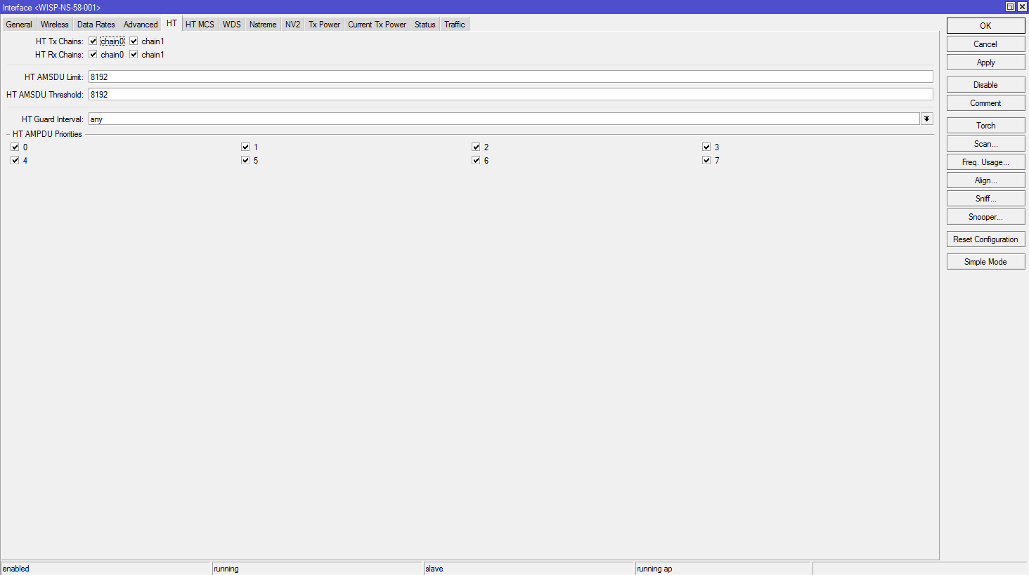 Testa na torre o HT guard interval em long, o datarate fica menor mas acho talvez MK tenha melhor desempenho com ele já que NV2 usa isso (O TX rate vai cair de 86M pra 78M).