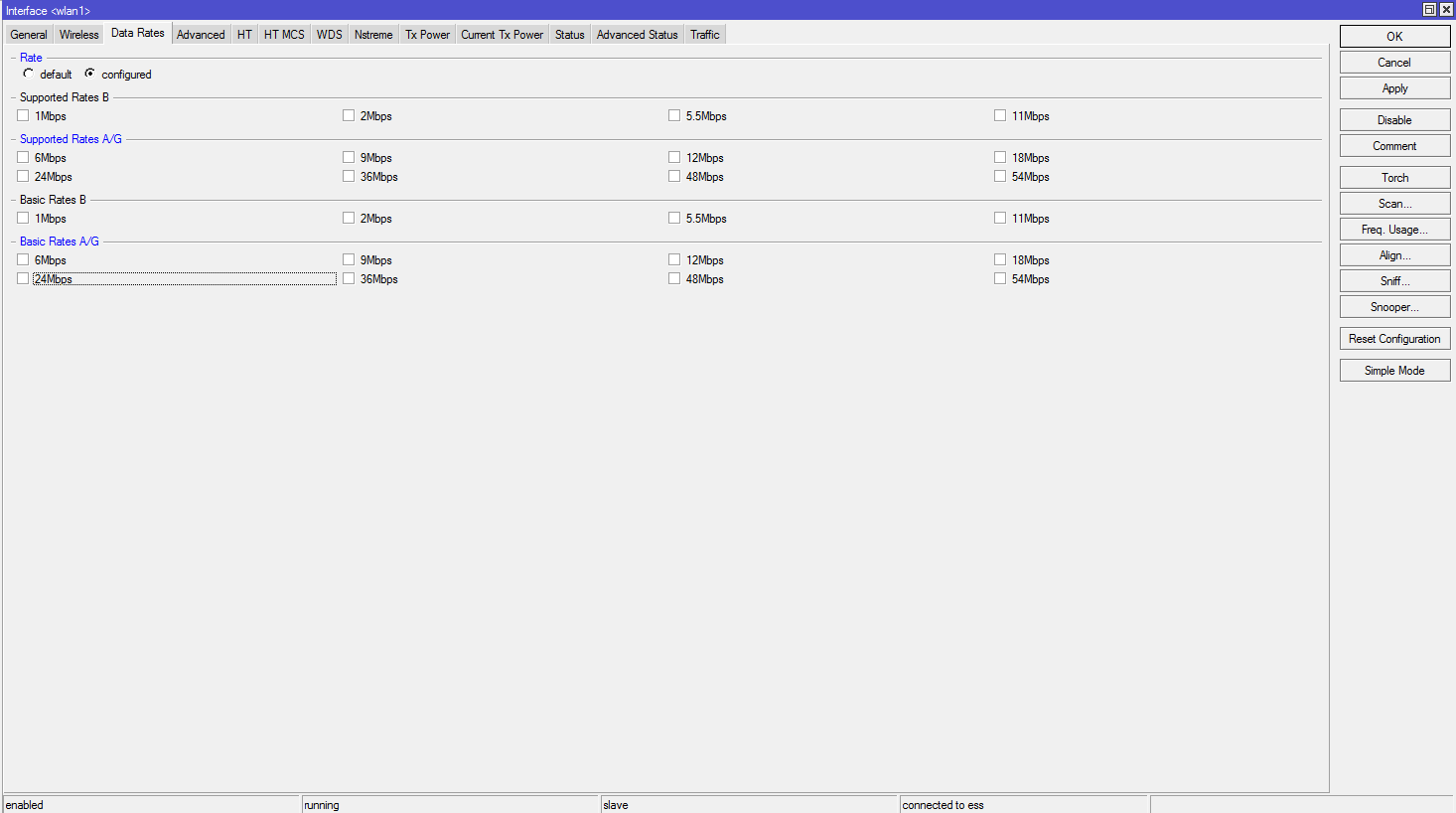 Para ativar/desativar determinados MCS, somente consigo colocando o Data Rates e Configured, caso fique em Default não consigo depois manusear os MCS.