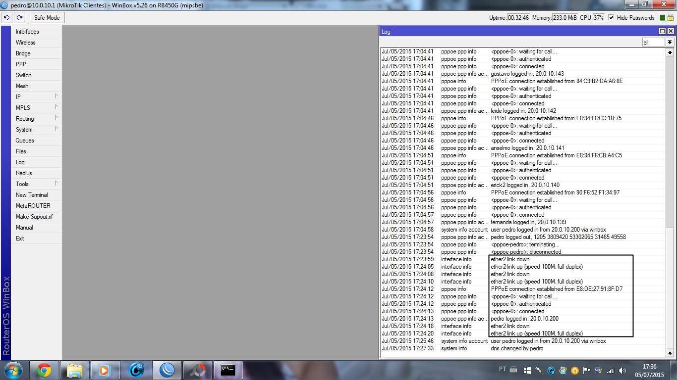 Es que falam sobre a "ether2 link down" e "ether2 link up" é normal. Sempre que você reinicializa o roteador, a ether2 vai ficar down pq a porta de rede do roteador é desligada, e religada novamente.