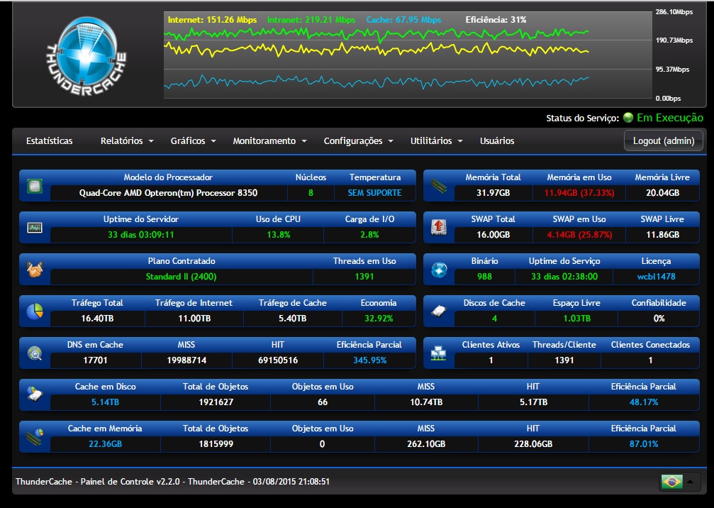 cache em rede com enlaces saturados, maquinas desktop e configuração erradas é problema mesmo, agora se estiver com a rede 100% e configurações corretas com certeza é uma ótima solução. Eu não fico sem, é perceptível na rede quando desativo o cache, ta ai um print de 33 dias on (se não fosse o nobreak estava bem mais) com thunder em modo bridge, 200mb de link, picos de até 90mb somente de trafego de cache, baixo consumo de de CPU e exelente economia.