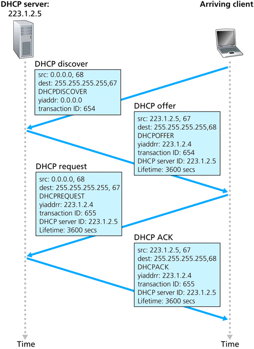 Como você pode ver na imagem abaixo, durante o processo de aquisição de um endereço IP de forma dinâmica, o Host envia um pacote para o endereço de broadcast, o servidor recebe este pacote e responde para o cliente informando que ele pode fornecer um endereço de IP pare ele, somente depois de conhecer o servidor DHCP o host solicita um endereço e o servidor responde com o valor do endereço IP.