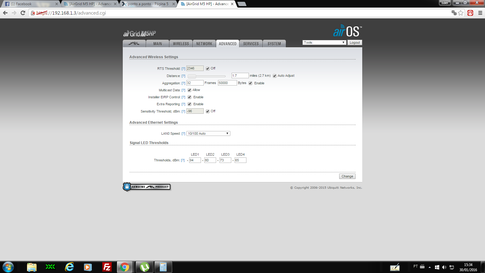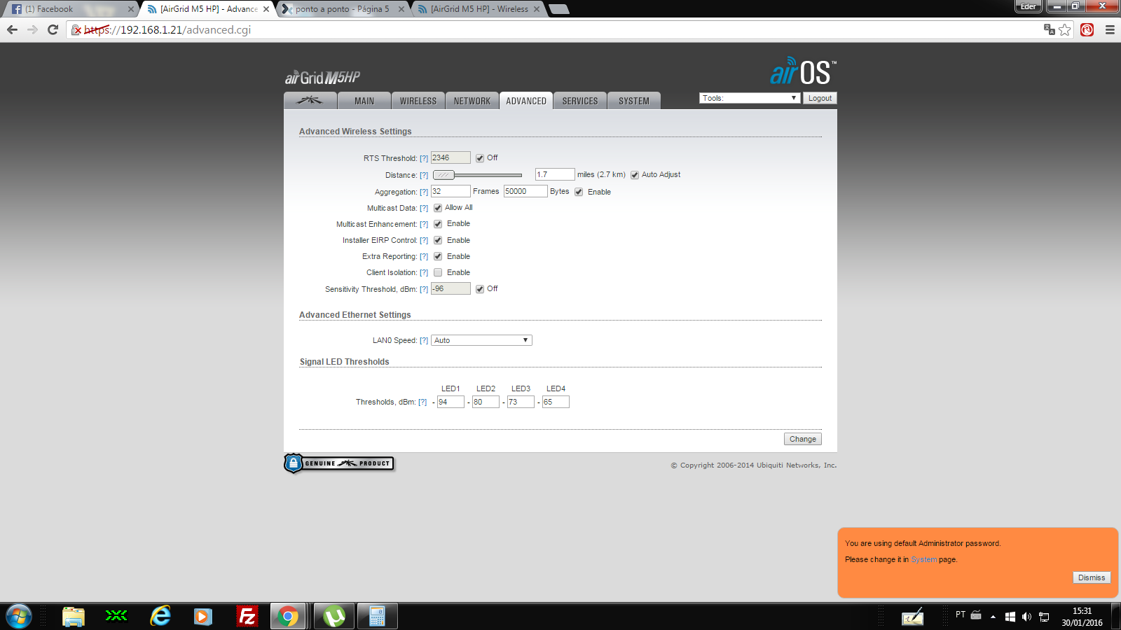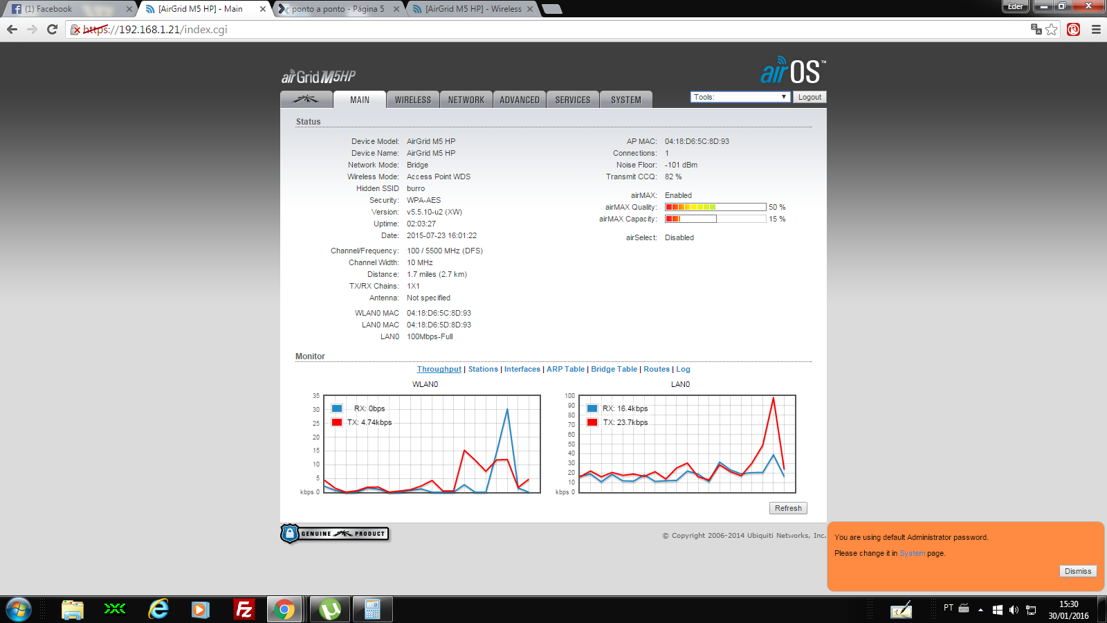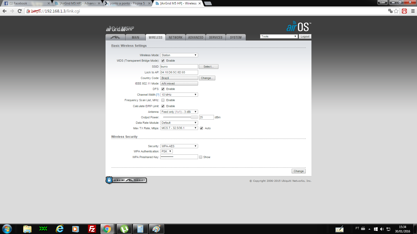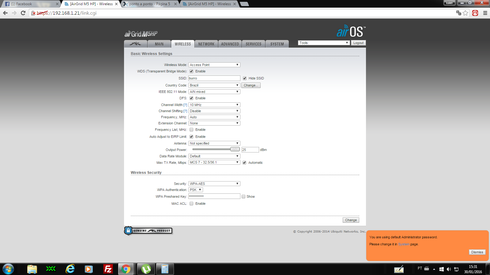 (Apesar de ter aeroporto perto, se usar o país Brasil na config., o DFS vai estar ativo automaticamente, não vai criar problema nem se tiver sistema de radar não-aeronáutico usando a faixa dos 5GHz, a atividade aeronáutica em sí não usa essa faixa, e o tipo de conexão necessária nas empresas nos aeroportos é grande, eles não podem usar PTP via rádio, tem que usar faixas licenciadas ou cabo mesmo pra conseguir a bandas altas que precisam, ou seja, dificilmente alguém no aeroporto vai sequer notar que PTP existe, que dirá chegar a ponto de incomodar pra gerar denúncia na Anatel)