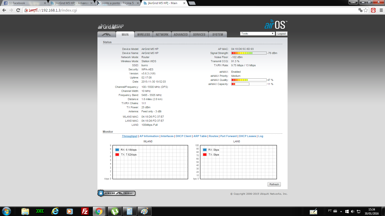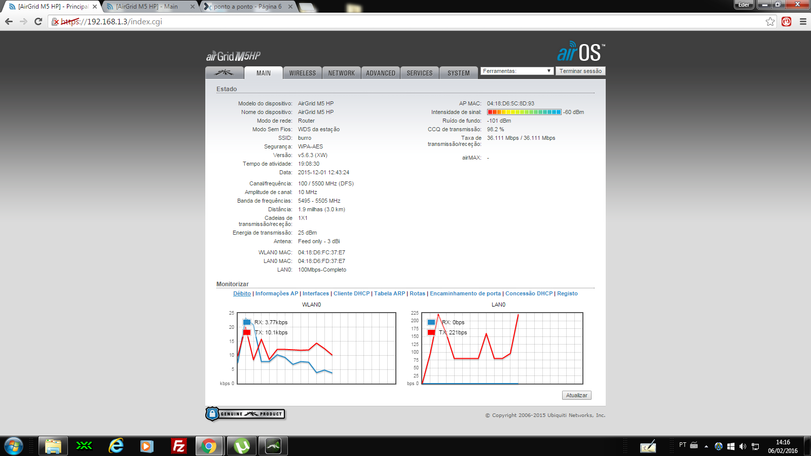O que a gente pode fazer é o que já foi dito! 1° Teste com o Airmax desligado ( e a primeira guia de todas com o simbolo UBNT). 2° Tem que analisar a freqüência.. Você esta deixando no automático e não pode! Não tem como eu dizer pra você colocar no canal X ou Y... Quem tem que executar um AIRVIEW é você que está conectado as antenas e ver qual freqüência está livre. 3° Pelas fotos, teu sinal tá indo de mal a pior, o que indica ser problema de montagem das antenas. Vou repetir o que todo mundo já disse.. Tua visada deve estar ruim....