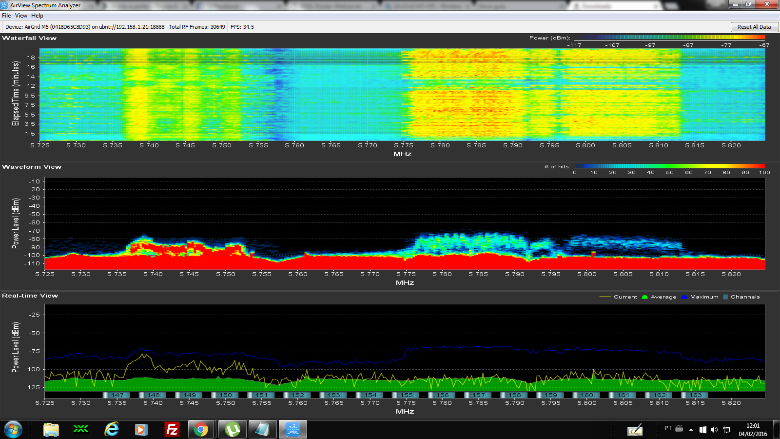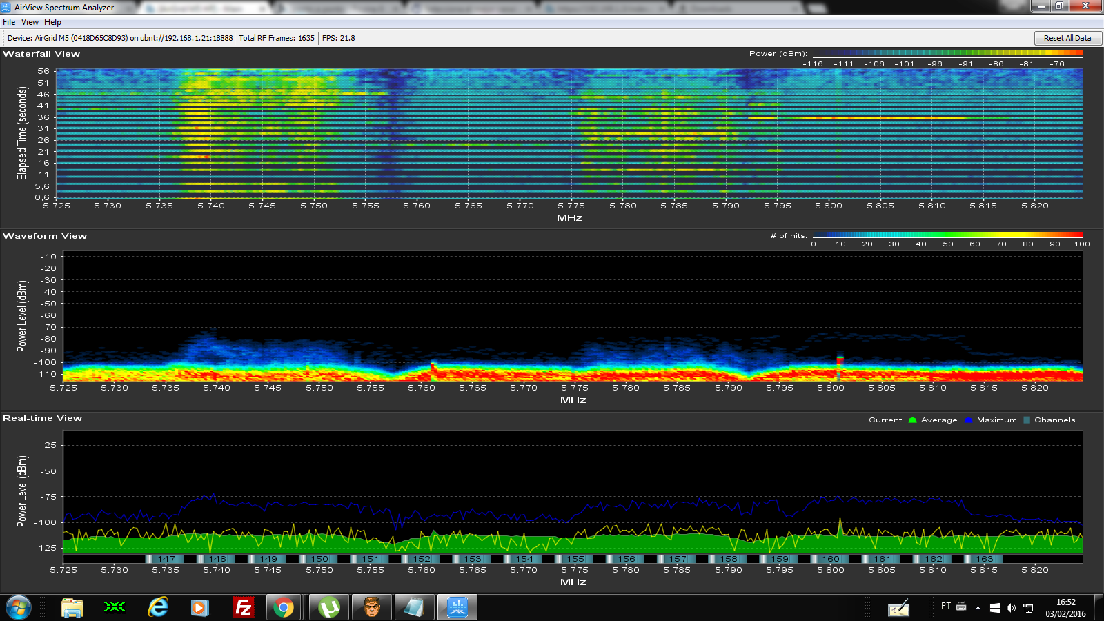 Tem um tanto de ruído aí amigo!!! Os melhores canais pra você setar seriam aí o 152 - 5.760Mhz 153 - 5.765Mhz 154 -5.770Mhz e acima do canal 160.