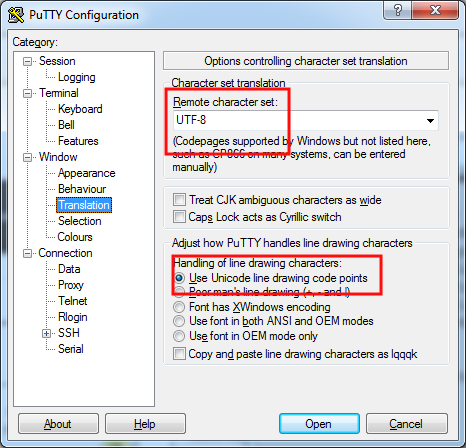 O default do Putty talvez seja ISO-8859-1, e geralmente se usa UTF-8 nos firmwares: