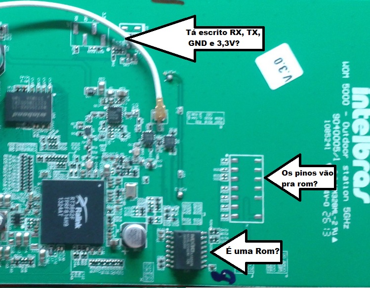 E de baixo do cabo do conector SMA, não está escrito RX, TX, GND e 3,3V? Se estiver, é por lá que se conecta via serial/TTL pra enviar/copiar o firmware, com um adaptador tipo