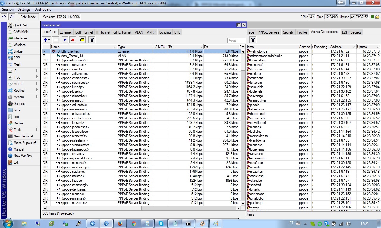 Observe neste print, tem cerca de 280 conectados pppoe, a maioria quase 5 dias, Pois fiz uma atualização e reiniciei o mikrotik com planos entre 3, 4, 5, 6mb. Processamento 14% + ou - .