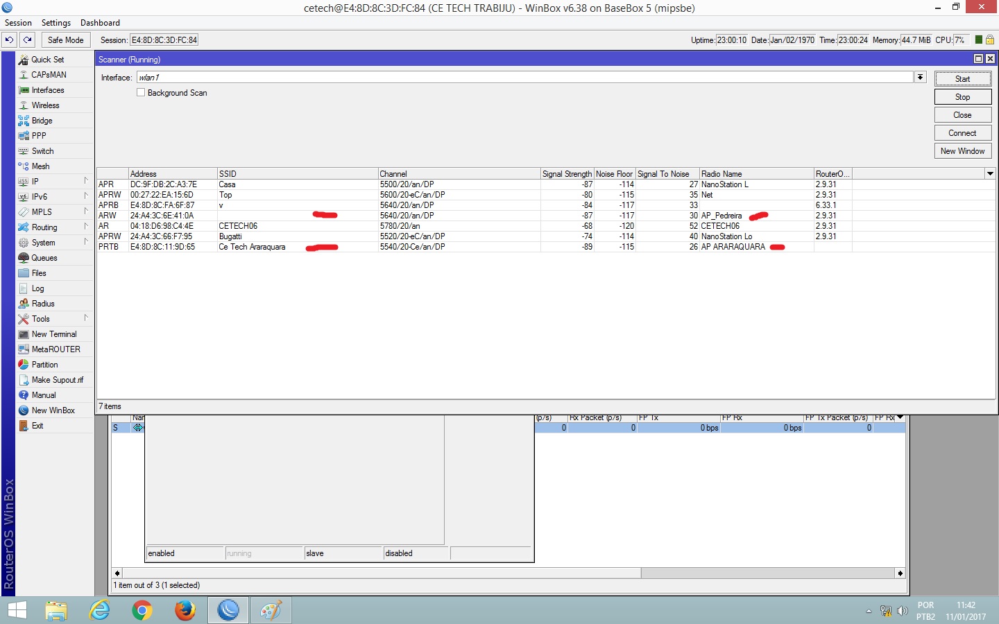 Olha o scan os APs que estão de vermelho estão em uma torre quase na mesma direção porem a 20Km mais longe e com vários obstáculos na frente, mas mesmo assim aparece o sinal bem fraco. Vou trocar o pingtail para ver o que acontece.