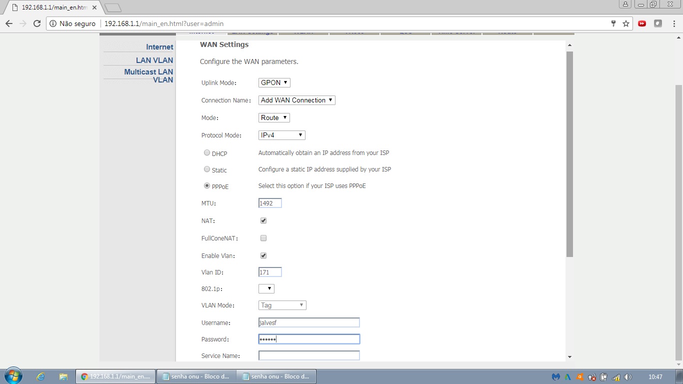 Você está habilitando a bridge e depois pelo firmware da onu configurando o pppoe na wlan.