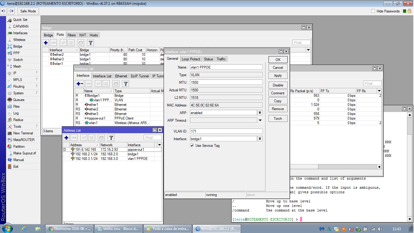 A vlan esta na bridge devido a outros serviços, esta rb não e a definitiva ainda, criei um servidor pppoe nela e apontei para a vlan, estamos fazendo os testes primeiro para so depois levar pra campo. as onu's estao ligadas nas portas pon com atenuadores para nao danificar.