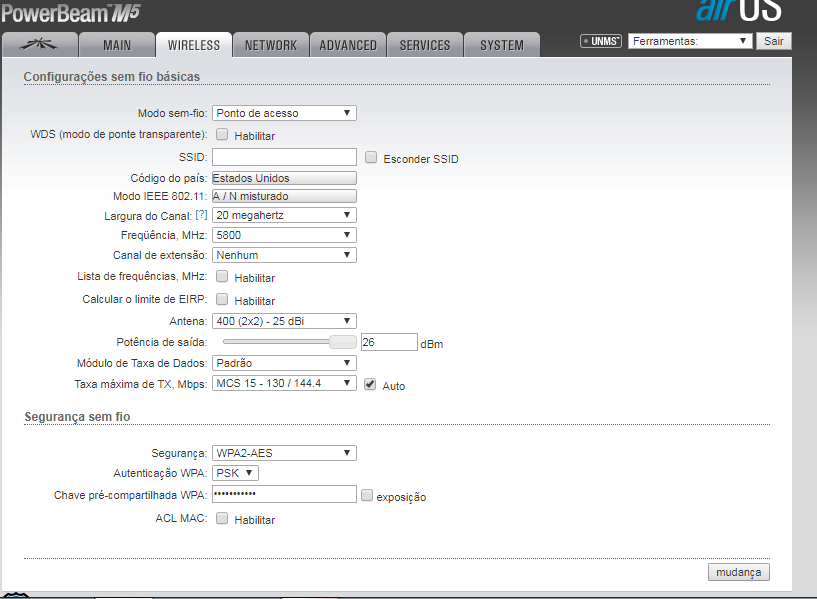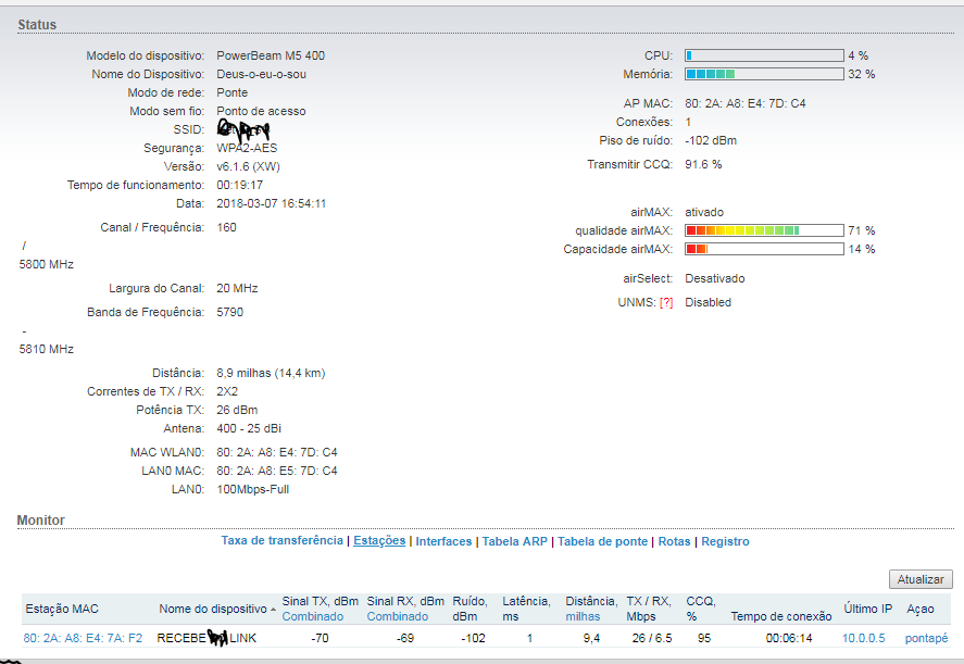 - como a sensibilidade da PB-M5-400 é -90dBm em MCS10, eu abaixaria potência de saída para 15dBm, ficando distante 25dBm da sensibilidade e com -65dBm no RX