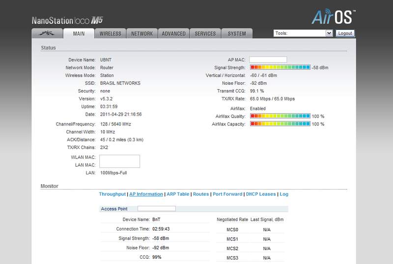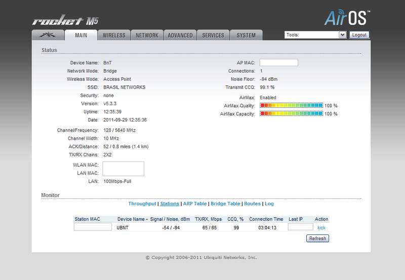 Olá a todos. Montei uma repetidora nova, toda em 5.8 usando equipamentos da série M5 da Ubiquiti (há fotos da infra-estrutura nos meus álbuns). São dois conjuntos BaseStation de 20dbi + Rocket M5.