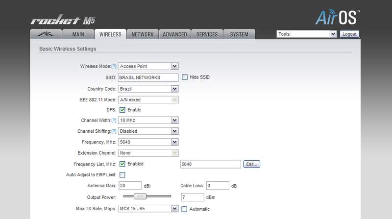 Comecei usando a "regra tradicional": canais na faixa de 5825 à 5850, largura de canal de 20Mhz e potência em 15dbm (32mw).