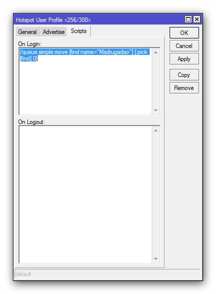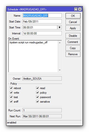 A partir dai já estaria funcionando perfeitamente na hora marcada que seria 00:01 até as 07:00, mas como disse estaria, porq pra quem usa hotspot a partir do momento que alguem logar seu controle de banda na queue vai esta acima de nossa queue " Madrugadao" depois de varias pesquisas e testes aqui na minha RB 450G com a versão 5.2 funcionou quando eu criei um Script pra mover a queue "Madrugadao" sempre para a posição 0 ( Ai sim funcionou perfeitamente ) vamos deixar de enrolação e vá até System Script e adicione um Script como no de "Subir Queue" e em source coloque: