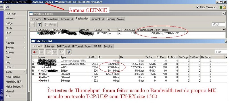 Este amigo, fez o curso do Gilvan logo no começo e eu vi um ponto a ponto de 60km com pacotes de 1500 passando 54mbps*2 de tx e de rx. Nstreme ativado.
