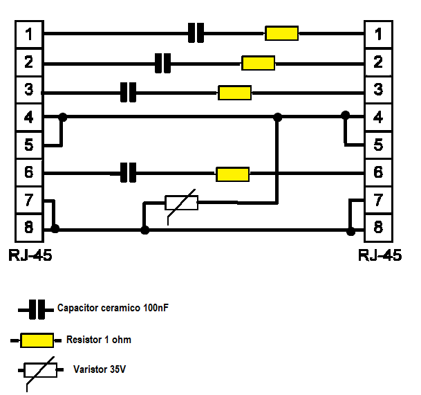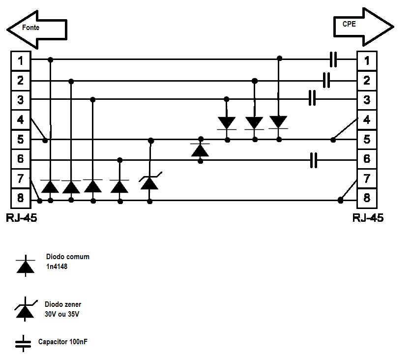 Ou seja, adapta um injetor pra usar em baixo (Ou pode adaptar isso na fonte UBNT também), e constroi um pra usar em cima, se for algo tipo mais de 10m de cabo ethernet exposto (Mais de 10m outdoor, não falo de 10m ao todo com só 2m outdoor e 8m dentro de paredes) seria bom. Com só uns 10m ao todo, com 1 ou 2m exposto pra fora do telhado, só esse protetor no injetor ajuda, mas não é tão difícil deixar a fonte POE quieta e fazer um protetor pra colocar só em cima, pra ficar realmente "igual" o SXT (Proteção na cpe e não no injetor).