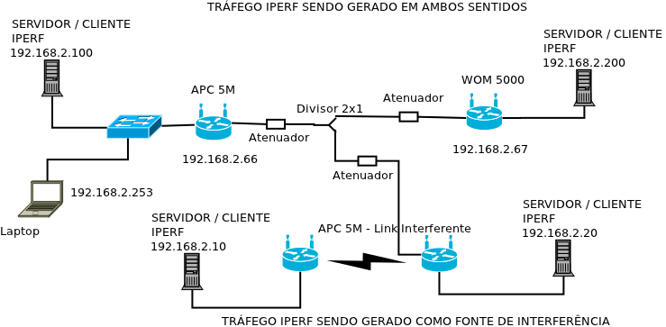 O "cenario.png" demonstra como foi feito o setup de testes. Temos um link com APC 5M (Access Point) e o WOM 5000, conectados diretamente por cabo. O divisor na figura serve para "injetar" o ruído do segundo link diretamente para o WOM 5000.