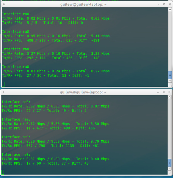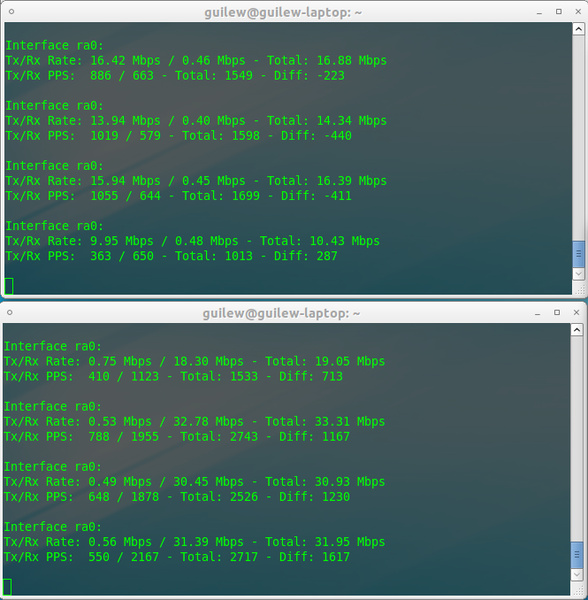 A imagem "sem_interferencia.png" ilustra como está o tráfego normal, em tempo real (Através de nosso utilitário "devstat"), na interface de rádio do APC 5M e do WOM. Este tráfego está sendo gerado por duas sessões de iperf, rodando em ambas as máquinas (2.100 e 2.200).