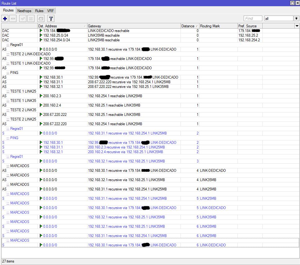 @AdrianoPJ, tenho 3 links balanceados em uma rb e um concentrador em outro, e tenho 3 classe de ips de clientes como ficaria pra os clientes de 1MB da ranger 10.1.1.0/24 sair pelo link1 e de 2MB 10.2.1.0/24 link2 e os de 3MB 10.3.1.0/24 sair pelo link3? tem como eu fazer rota estática em um rb  os clientes do concentrar saírem pelas rotas do balance dessa forma?