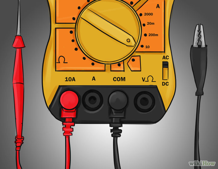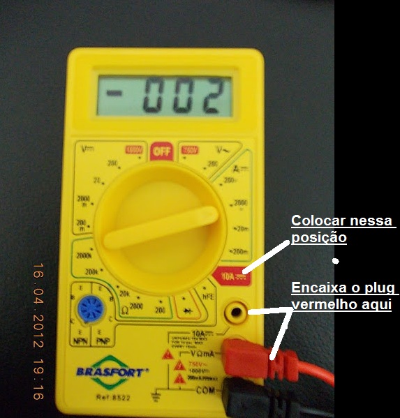 Pra medir corrente você tem que colocar o multímetro na escala correta, a maioria dos multímetros tem uma escala escrito 10A ou 20A, coloca nela, e o plug vermelho geralmente também tem que ser plug no plug escrito 10A ou 20A, seria assim: