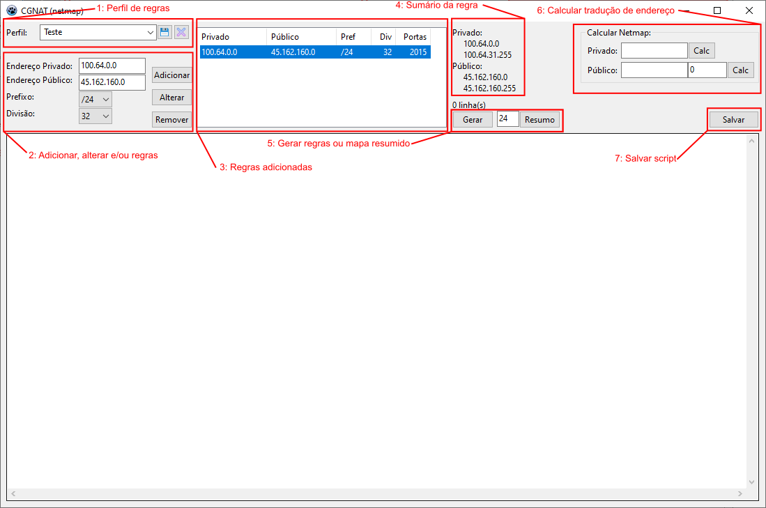 Apresenta um sumário da regra selecionada, indicando o primeiro e o último endereço privado e público que será utilizado por essa regra. Facilita na confecção do conjunto de regras caso se vá utilizar mais de uma.