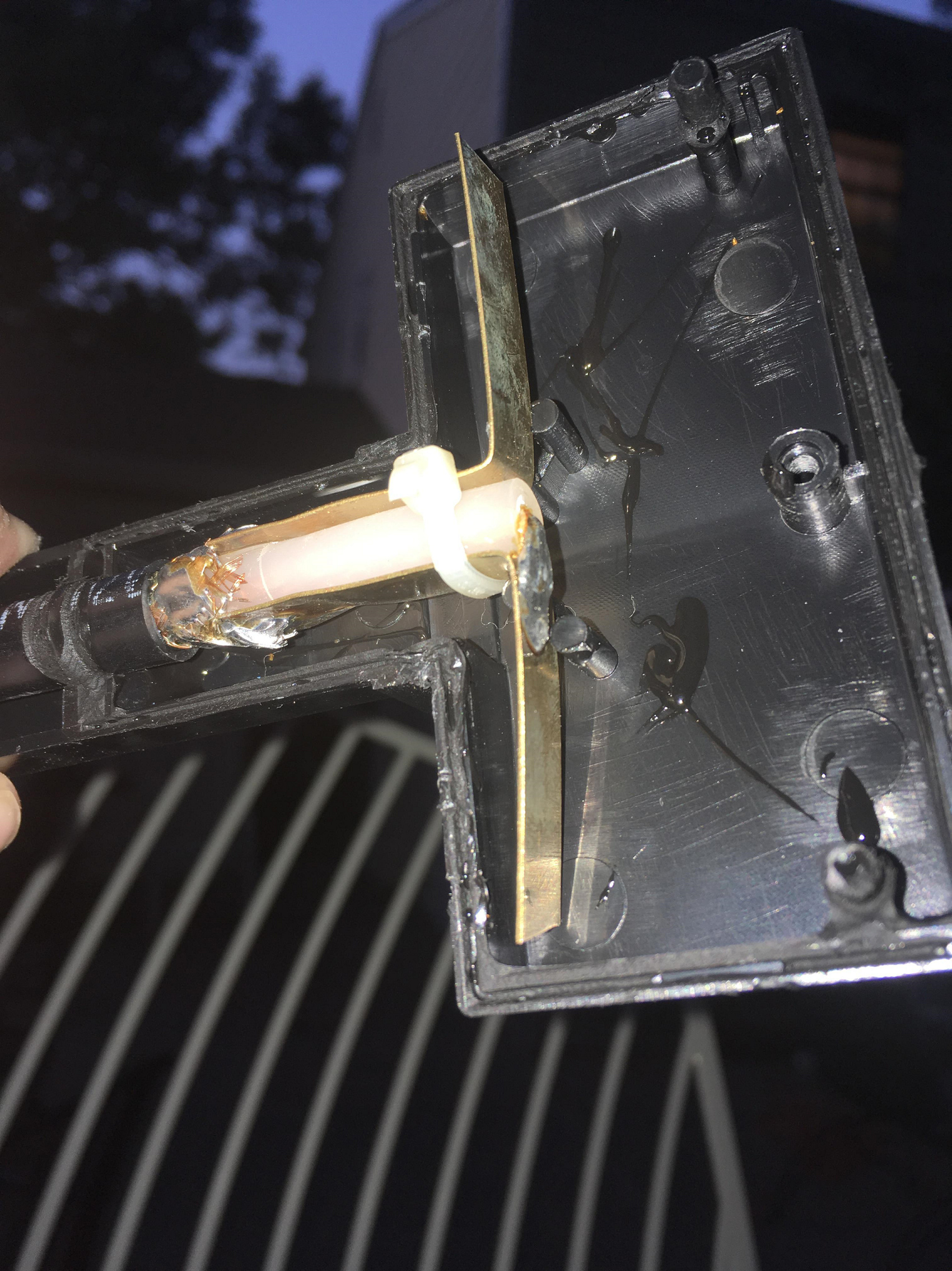 Esta é a imagem de dentro de um dipolo de 2.4Ghz=2400Mhz de fabricação americana. Um pernambucano já falecido instalador de antenas no interior de Pernambuco fazia antenas caseiras modelo yagi de 850 e 900Mhz e instalava para os clientes dele com cabo Rg06. Ele dizia que testes feitos em campo entre uma yagi da Aquário com selo da ANATEL e a caseira fabricada por ele; a antena caseira dele tinha melhor ganho de sinal, e que inclusive já chegou até a substituir antenas yagis da Aquário de clientes insatisfeitos por as dele, e tornaram clientes satisfeitos. Enfim, uma antena se resume em apenas um cálculo de uma fórmula matemática constante de: 300÷frequência=comprimento de onda completa, e que por sua vez é acrescentado vários elementos diretores em um tubo de metal para dar maior ganho de sinal a antena.