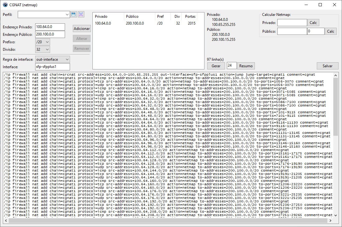 Você pode criar vários perfis de conjunto de regras e deixar gravado com um nome específico. Por exemplo, um perfil para cada roteador que faz CGNAT, com endereços diferentes.