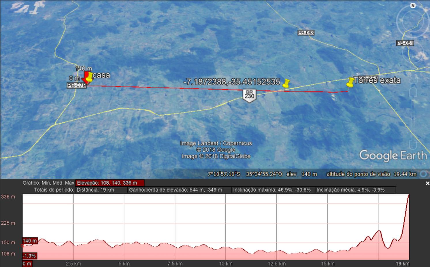 Considerando que a potência de saída no repetidor é de 20dBm (em amplificação máxima com sinal total de entrada= -50dBm), a frequência de operação é 1800Mhz e a distância informada no seu primeiro post é 17Km.