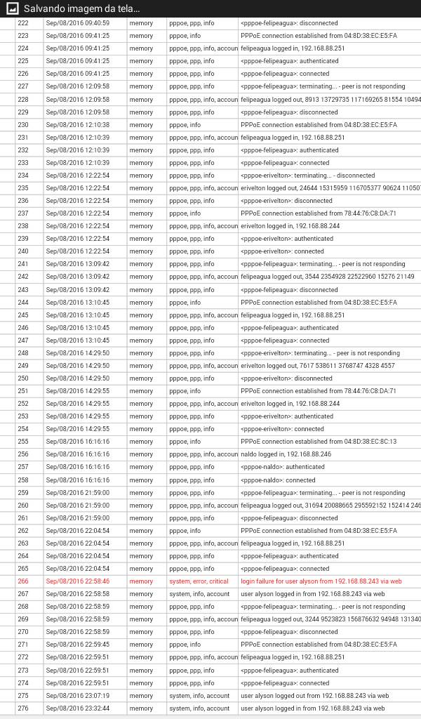 Só recapitulando, não tenho o KeepAlive ativado, eu desativei o mesmo, o one session per host está ativado, e o only one também, quando ocorre a desconexão do pessoal, como já havia falado, são e locais completamente remotos, se fosse 1 ou 2 ou até umas 6 pessoas, tudo bem, mas são 10 ou mais, dá a mensagem peer is not responding, demora coisa de 3 minutos e relogam novamente, isto se dá de forma aleatoria, sem aparentemente motivo algum até por que se fosse ocorrer quando chovesse por exemplo eu poderia até deduzir que pudesse ser cabo ou coisa do tipo, mas não é o que acontece. Não entendo muito bem sobre o PPPoE, mas sei que colegas meus não tem tal problema, isto se deu após a minha troca de Hotspot para PPPoE, que ocorreu já faz uns meses.