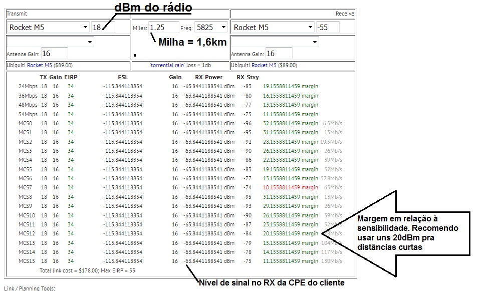 Mas o equipamento dos clientes nem sempre é bom, tem muita CPE barata que só tem 17dBm de potência, se a antena é de 12dBi, isso dá 29dbm EIRP.
