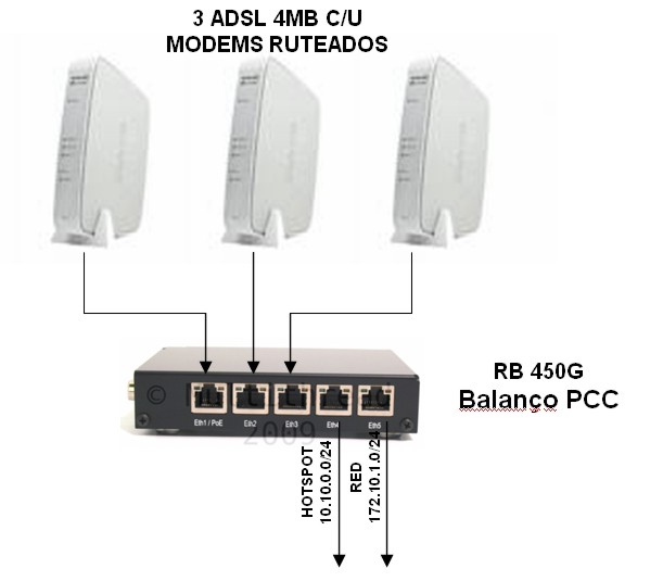 O balanceamento como passei anteriomente vai ficar no servidor do outro lado e não onde esta os DSL´s só que o servidor vai ficar com 5 placas de redes uma para os clientes separadas e as outras quatros tb no mesmo swintch pois cada saida da placa vai usar a rota do ADL e o radios fica somente em bride.