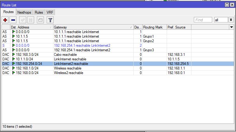 Já tentei várias configurações de rota em IP/Routes, mas não consigo acessar a WEB do Rocket M2 que tá no com "Routing Mark" Grupo3, mas consigo acessar normalmente Web dos Modems e do Bullet M2 na Interface Wireless. A ÚNICA forma que tenho pra acessar a interface web do rádio é conectando diretamente via Wireless no AP Rocket ou colocando em "Dst. Address" o endereço do Gateway 192.168.254.1 ao invés de 0.0.0.0/0. Nos outros grupos coloco dst address o IP da Interface, no caso 10.1.1.5 (Link Internet) Grupo1 e o mesmo no Grupo2, o campo "Gateway" em ambos coloco o IP do modem. Agora se eu fizer o mesmo no Grupo3, o trafego fica praticamente todo em um modem só, dai defino o "dst address" desse grupo pra 0.0.0.0/0 e tudo fica perfeito, mas aí não consigo mais acesso à interface do Rocket M2. Alguma idéia. Observem as imagens que eu vou postar pra ver se ajuda.