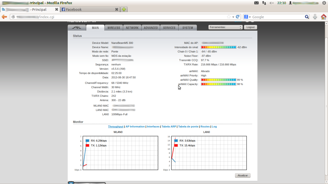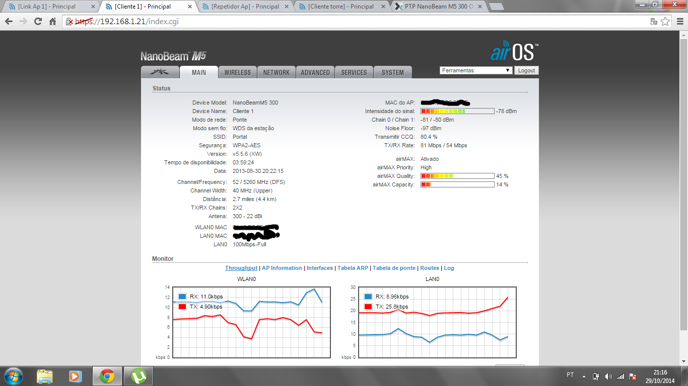 O que ocorre é o seguinte, tenho um PTP de 5 Km Utilizando a CPE NanoBeam M5 300 AP e EST, o alinhamento aparentemente pelo airmax está tudo correto, CCQ 99% e o sinal está -60 dBm. Não utilizo torre nesse PTP, volta e meia o airMAX quality e capacity, ocilam de quality 99% e capacity 97% para 66% e 46% a taxa de transmisão cai pra 4 Mbps, com ou sem clientes ativos. Quero saber se isto ocorre devido a interferencia, alinhamento incorreto ou algo adverso... desde já, agradeço!